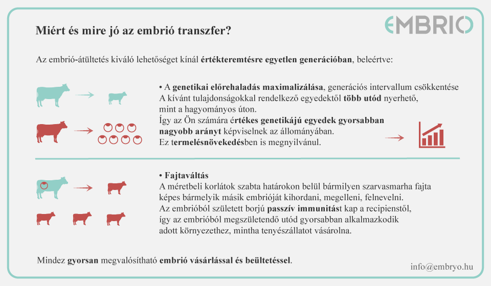Nagyállat szaporodásbiológiai tapasztalattal rendelkező állatorvosoknak, inszeminátoroknak. Embrió-előállítás, beültetés, és kiemelten azok teljeskörű laboratóriumi feldolgozása és fagyasztása. Helyben a saját nagy létszámú telepen és extrán felszerelt laboratóriumban zajlik, ahol rutinszerűek az embrióprogramok.