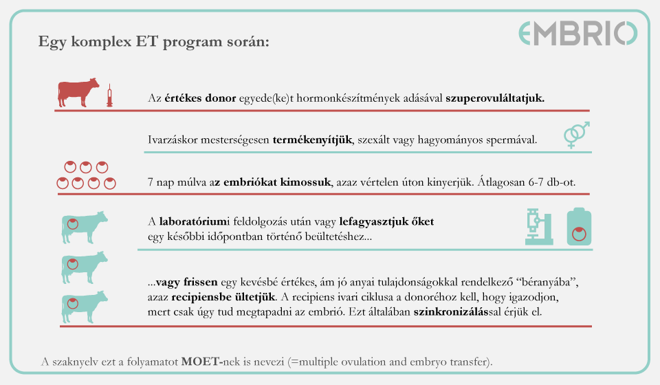 Egy ET program tartalmazza a donorok panziós tartását Pakson, az embriók kinyerését, fagyasztását és beültetését (frissen vagy fagyasztva). A szükséges hormonkészítményeket, eszközöket és anyagokat, továbbá a recipiensek tartására és előkészítésére vonatkozó szaktanácsadást.